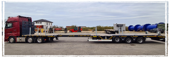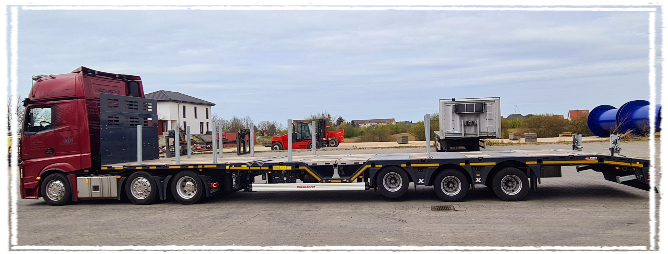 1x Dreiachs-TelemegaNutzlast: 36 tLadehöhe: 1,05 mLänge ohne Auszug: 13,60 mGesamtlänge mit Auszug: 18,60 mBesonderheiten: Radmulde Schwerlast-Auffahrrampen Rungen